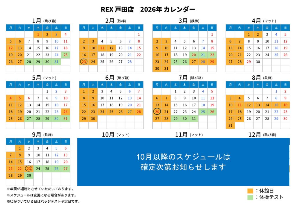 当教室では、年間45週制でレッスンを実施しています。体操種目はマット運動・跳び箱・鉄棒の3種目を2か月ごとにローテーションし、バランスよくさまざまな動きを習得できるよう計画しています。2か月の最後の週にはテストを実施し、成長の確認や次のステップへの目標設定を行います。